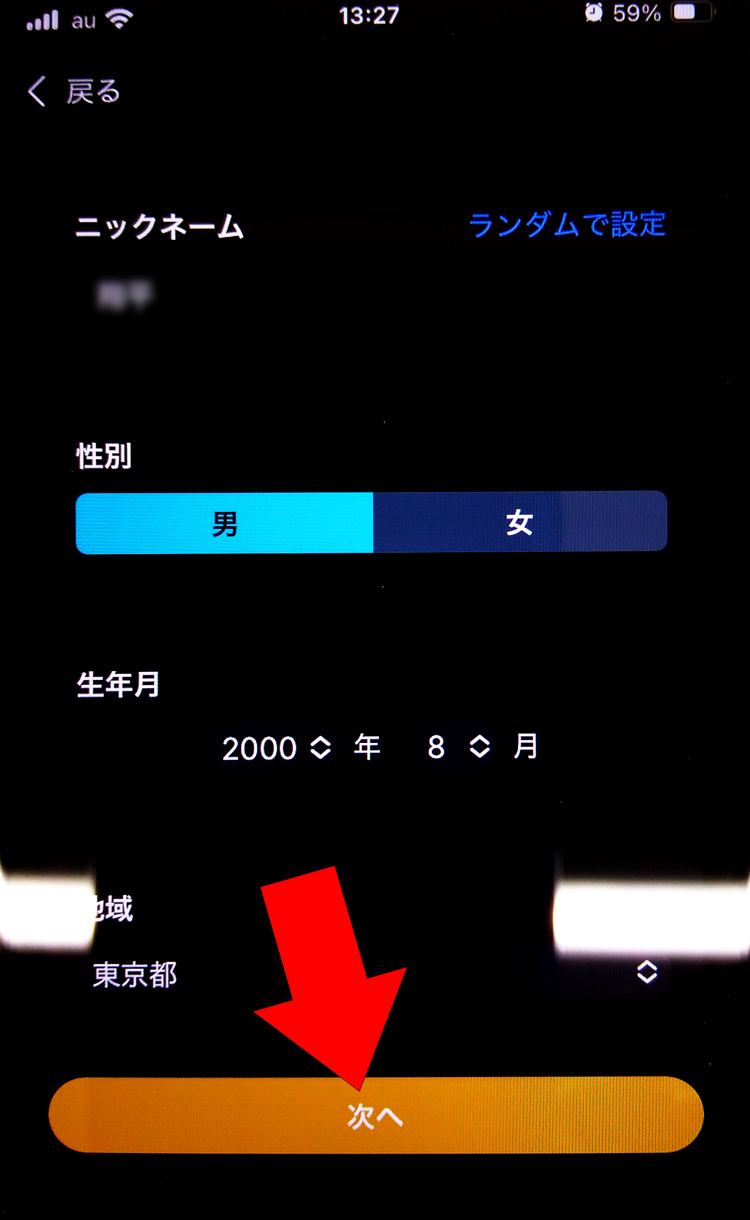 ニックネーム、性別、生年月、お住いの地域を設定します。