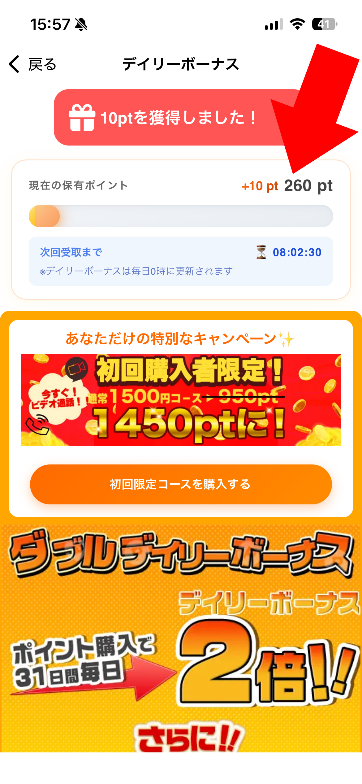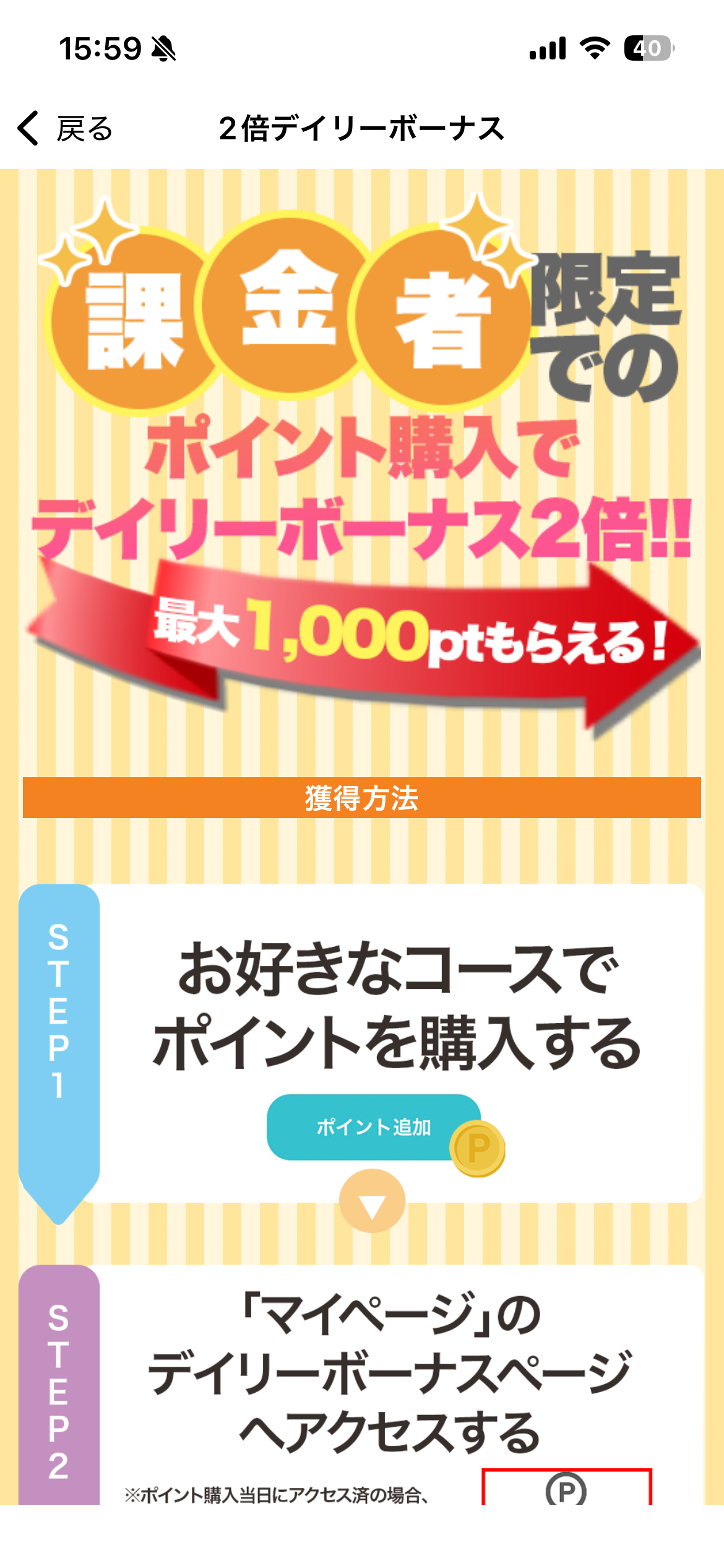 初回限定コースやポイント購入後にデイリーボーナス2倍も併用すると、有料ではありますがお得にポイントを増やすことができます。