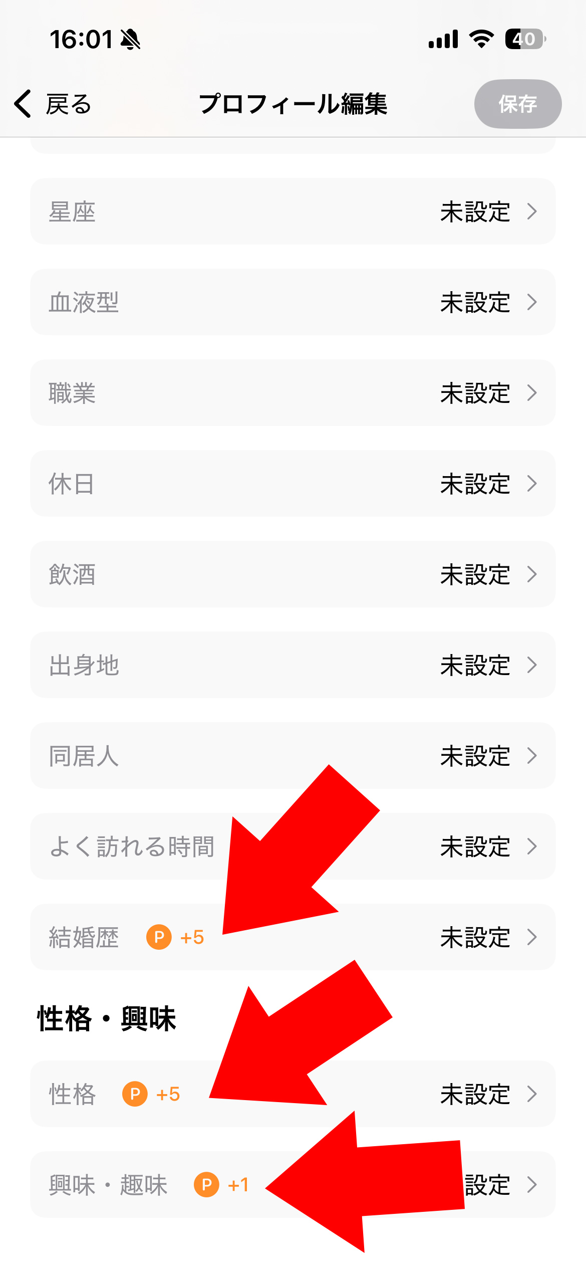 結婚歴5ポイント、性格5ポイント、興味関心1ポイントゲットできます。